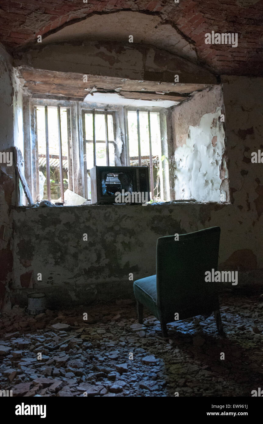 Broken Tv And Abandoned Chair Inside Nocton Hall In Lincolnshire England Uk Stock Photo Alamy
